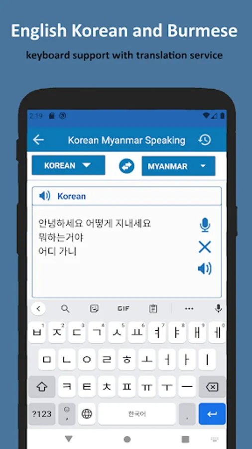 Korean Speaking For Myanmar language course teach: alphabet, vocabulary, grammar, travel phrases and pronunciation, etc. Myanmar And English Speaking & Korean Language Myanmar will train your reading, listening, speaking and writing skills in just Few days. Self-studying a new language with English To Burmese Voice Translator & Korean Language Learning Myanmar is truly efficient and effective.