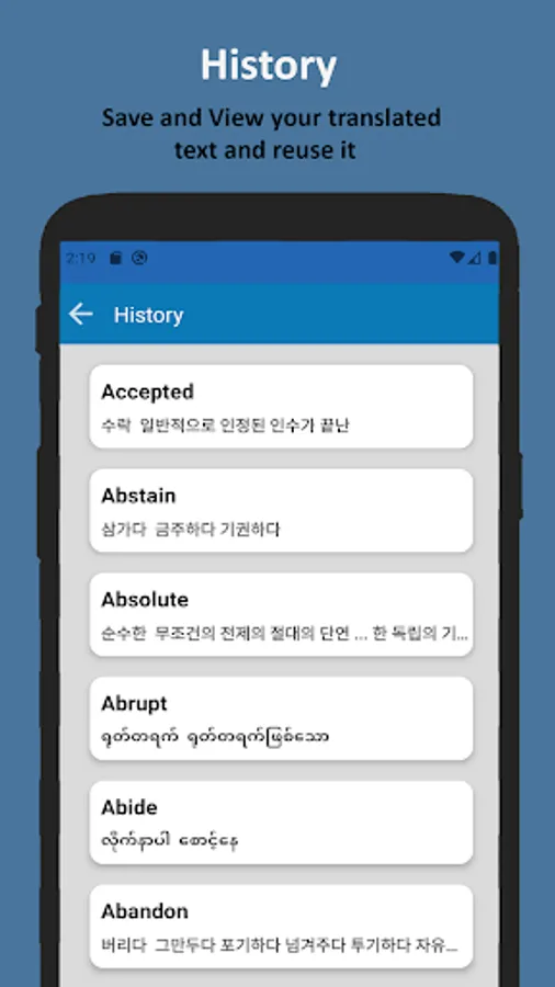 Myanmar Korean Translator App is completely free for all the users. You can translate whole paragraph Korean to Myanmar language. Korean Myanmar Translator and Burmese Korean Translator application is best to translate texts very fast in your cell phone or tablet.