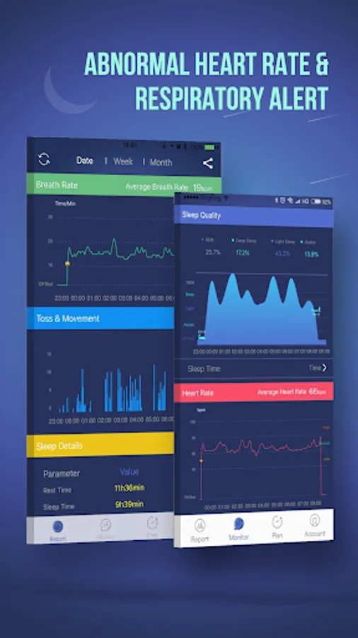 (6)Detailed sleep parameter description,show on bed time,deep sleep time,light sleep time,slept time,sleep efficiency, average heart rate and average breath rate and other data indicators;