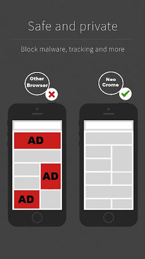 Secure browsing. Our secure browser warns you in case of malware and adware. It also helps you avoid viruses, phishing, and other scams and assures secure browsing. Neo Crome Browser blocks tracking so you can be sure no websites or advertisers track your online activities.