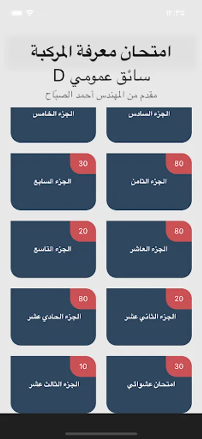 The application displays all the questions of the vehicle knowledge exam for a public driver’s course, which is 13 chapters and each chapter contains the number of questions it contains. In addition to all these chapters, there is a special chapter with 30 questions that completely simulates the Ministry’s exam as it chooses random questions from all chapters, with best wishes for you with success