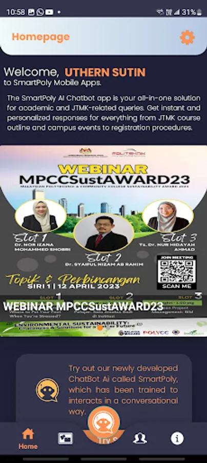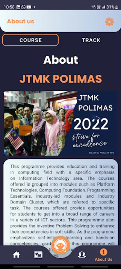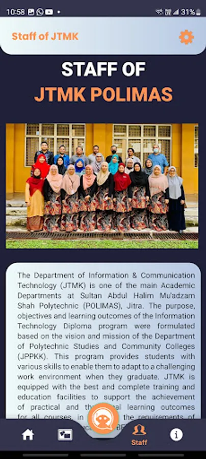 The SmartPoly AI Chatbot app is your all-in-one solution for academic and JTMK-related queries. Get instant and personalized responses for everything from JTMK course outline and campus events to registration procedures. The app're AI-powered chatbot called SmartPoly Bot that will provide assistance about JTMK department-related inquiries and provide access to official department announcements and notice boards to students simultaneously.