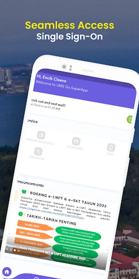 Terima kasih kerana memuat naik aplikasi UMS Go SuperApp, app rasmi UMS yang direka khas oleh JTMK untuk kegunaan warga UMS (kakitangan dan pelajar). Aplikasi mobile ini menggabungkan pelbagai perkhidmatan rutin universiti yang berkaitan akademik, pentadbiran, penyelidikan dan inovasi serta kewangan yang dapat dicapai dengan mudah melalui telefon pintar anda.