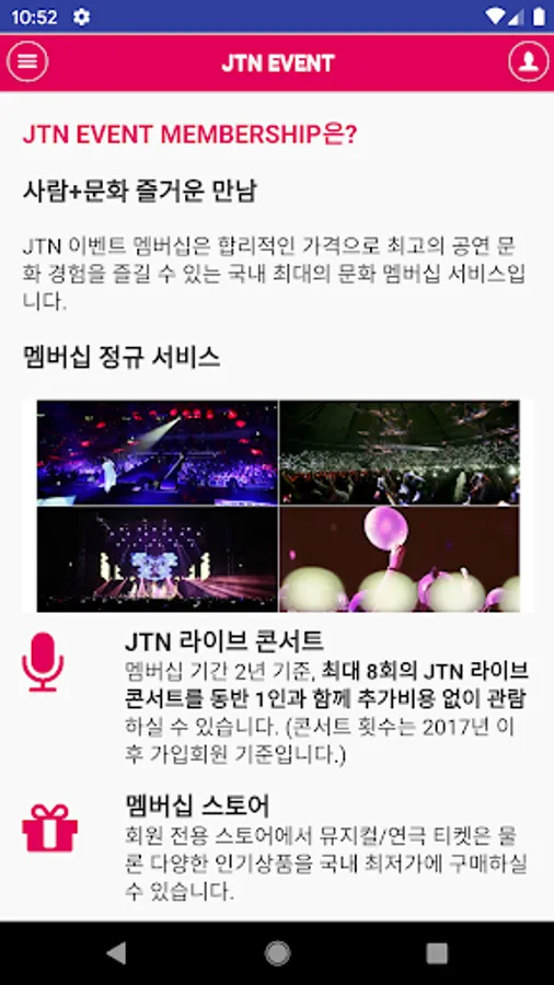 JTN 이벤트 앱을 이용하시면 멤버십 서비스 예약/이용이 더 간편해지며 멤버십 카드 없이 앱 내 바코드생성을 통해 JTN 정규서비스 공연 관람이 가능합니다.
