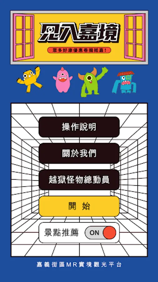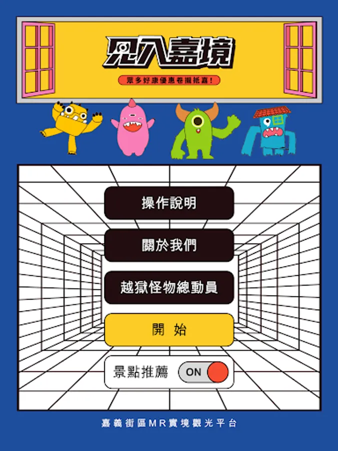 Open the APP and enter the home page menu: Operation Instructions, About Us, Prison Break Monsters and Tour Start.