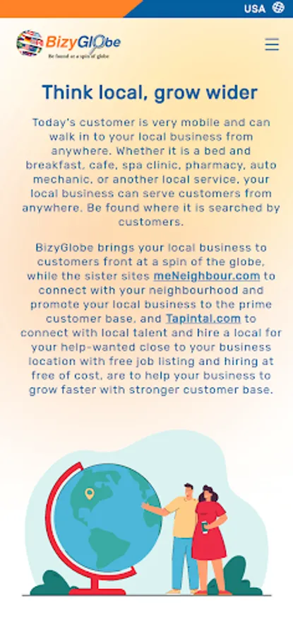 Find local business at a spin. Whether it is  a cafe, salon, spa, legal service, pharmacy, dentist or any local business or service,  will be found at a spin of the globe. BizyGlobe, your local business directory.