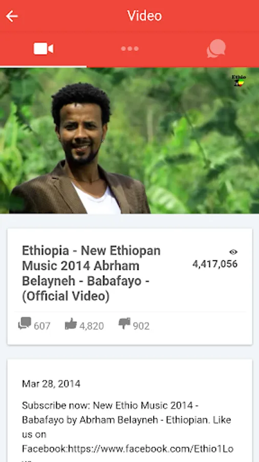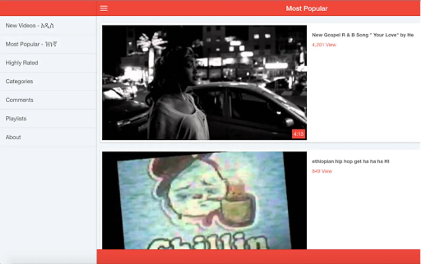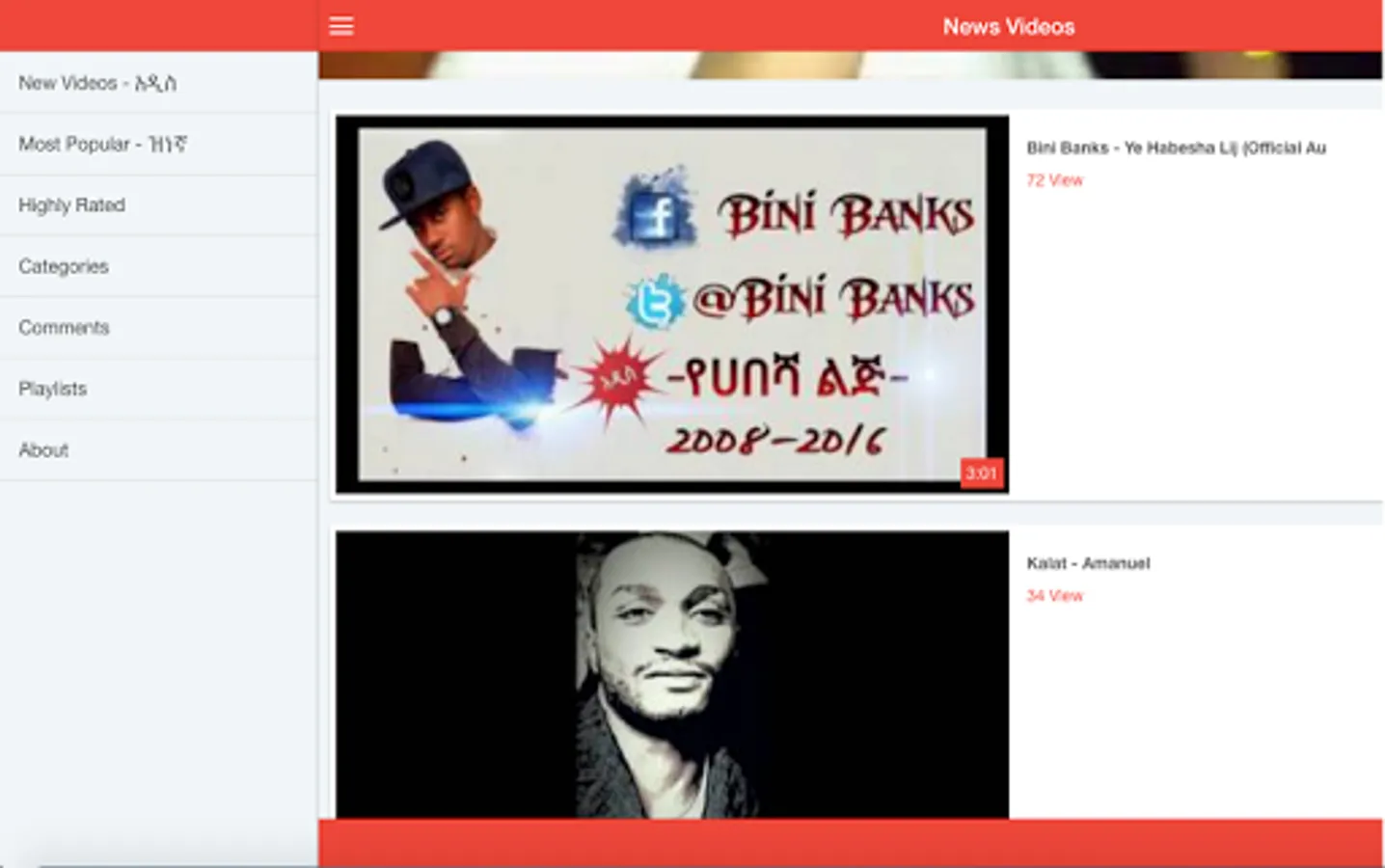 This app is designed for our users who enjoy world music. Use this app to enjoy thousands of Ethiopian videos from music, drama, movies, travel and many many more. Also watch video from more than 30 categories. Install now free and don't forget to like 5 stars.