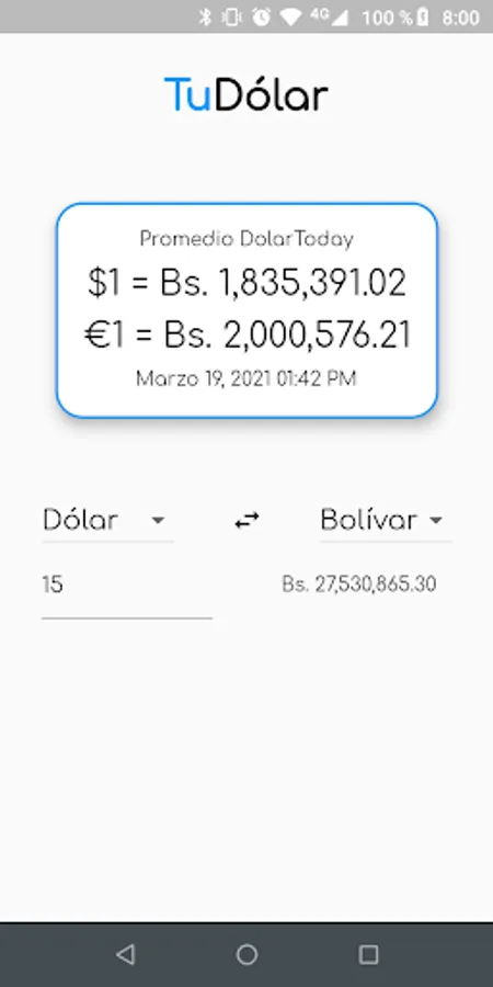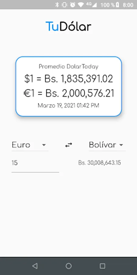 You can convert any amount between the three currencies (dollars, bolivars and euros).
