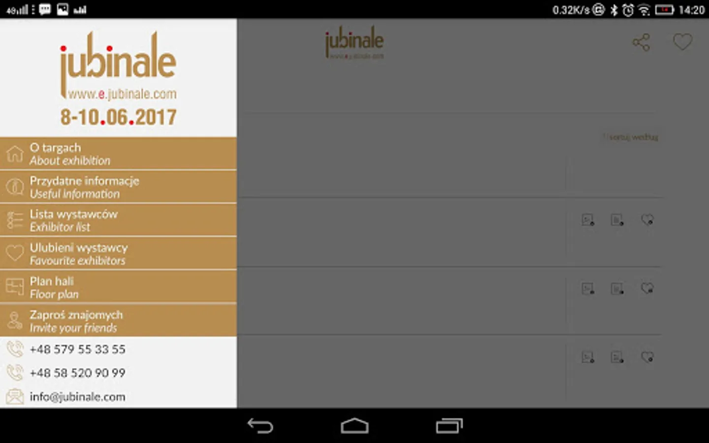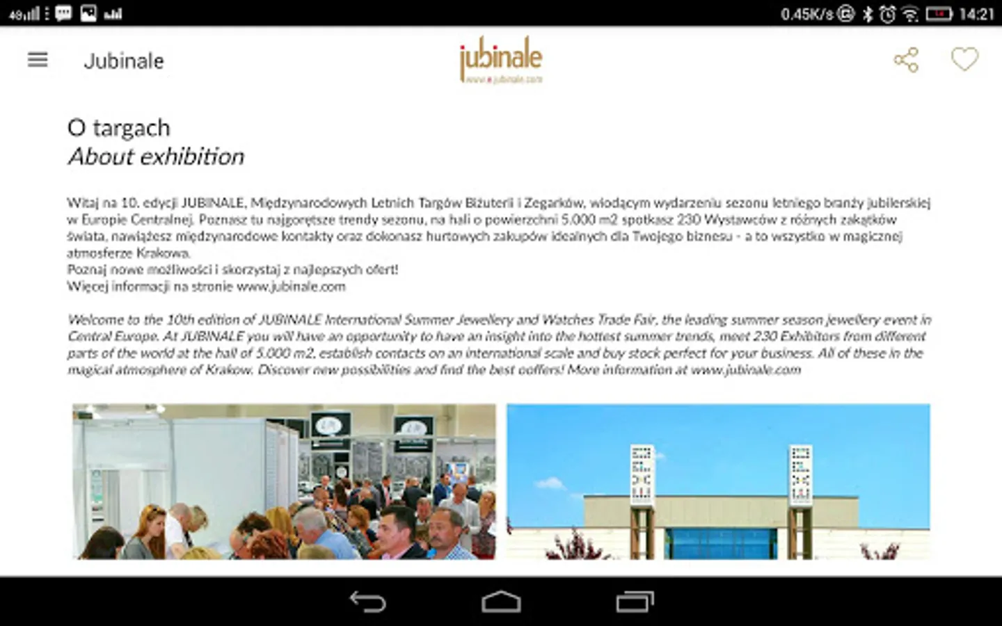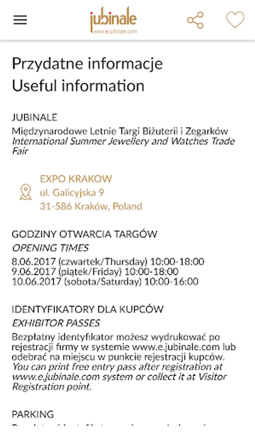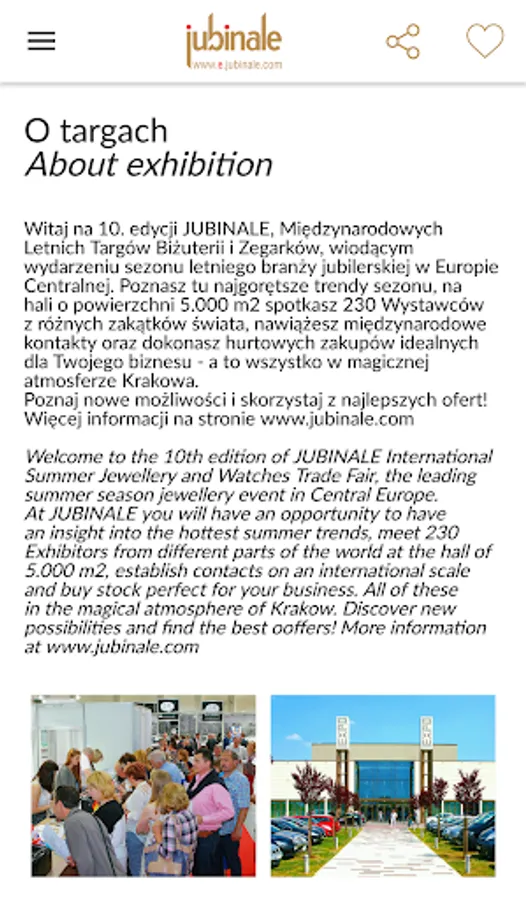 An app for participants of the International Summer Jewelery and Watch Fair JUBINALE. The next edition of the fair will be held on 13-15.06.2019 at EXPO Kraków, ul. Galicyjska 9.