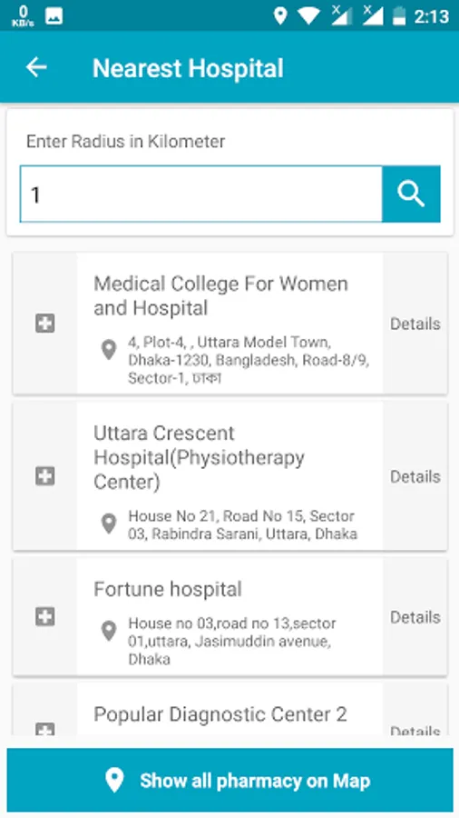 User may check details any single pharmacy or hospital or may see all the places in a single map.