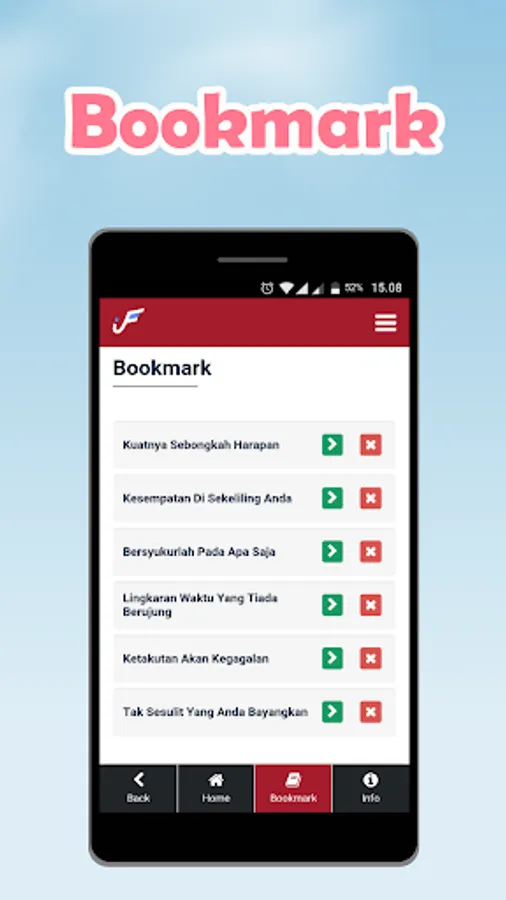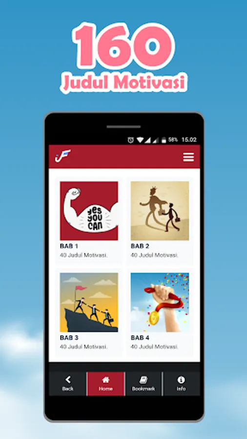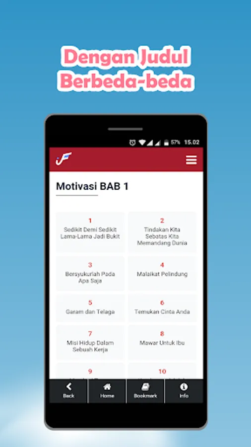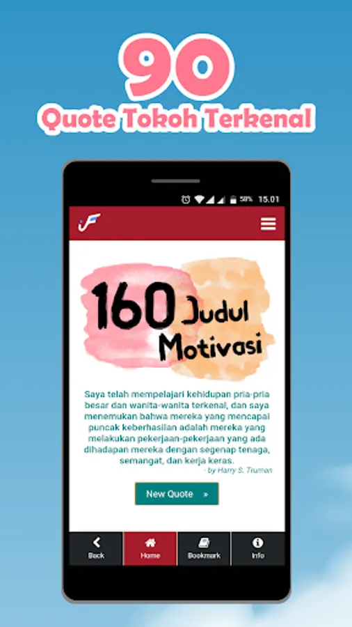 In this application there are 360 Motivational Titles and 90 Quotes from famous figures. It is hoped that it can open our minds about life views and become self-motivated so that they become better individuals. There are several advantages in this application, namely: