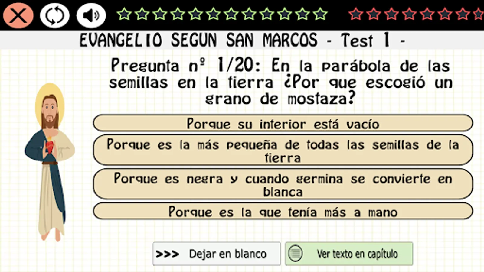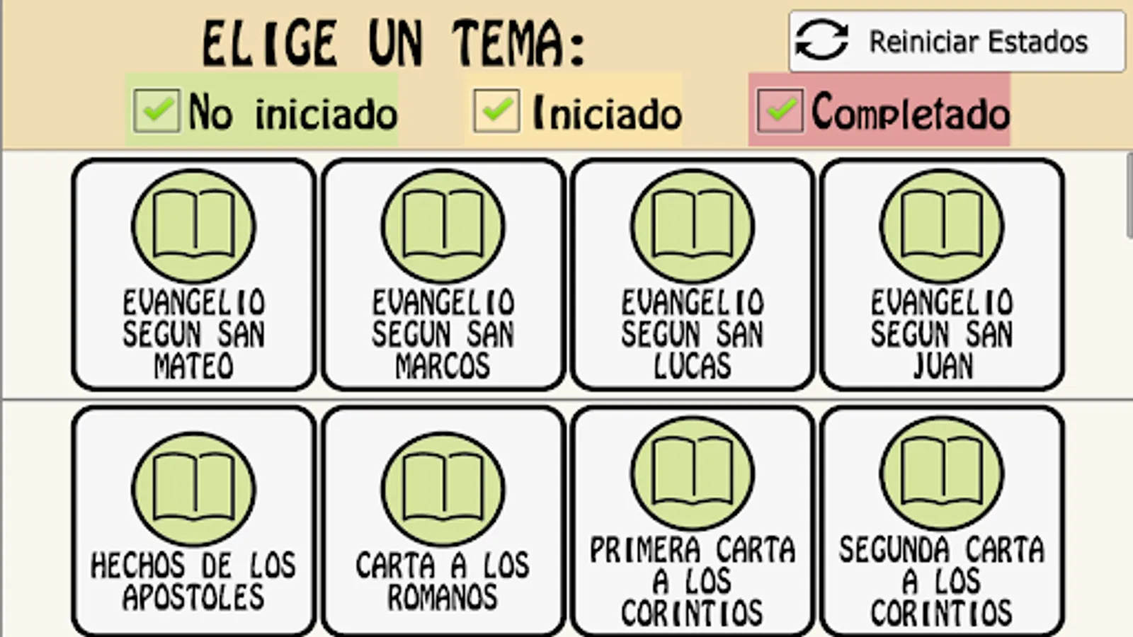 - Questions about the books of the new testament (GOSPEL ACCORDING TO SAINT MATTHEW, GOSPEL ACCORDING TO SAINT MARK, GOSPEL ACCORDING TO SAINT LUKE, GOSPEL ACCORDING TO SAINT JOHN, ACTS OF THE APOSTLES, LETTER TO THE ROMANS, FIRST LETTER TO THE CORINTHIANS, SECOND LETTER TO THE CORINTHIANS , LETTER TO THE GALATIANS, LETTER TO THE EPHESIANS, LETTER TO THE PHILIPPIANS, LETTER TO THE COLOSSIANS, FIRST LETTER TO THE THESSALONIANS, SECOND LETTER TO THE THESSALONIANS, FIRST LETTER TO TIMOTHY, SECOND LETTER TO TIMOTHY, LETTER TO TITUS, LETTER TO PHILEMON , LETTER TO THE HEBREWS, LETTER OF JAMES, FIRST LETTER OF SAINT PETER, SECOND LETTER OF SAINT PETER, FIRST LETTER OF SAINT JOHN, LETTER OF SAINT JUDE, APOCALYPSE).