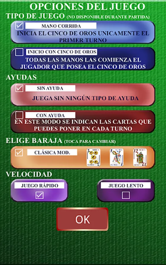 Once the options are selected, the application saves them, so that you do not have to select them in each game.