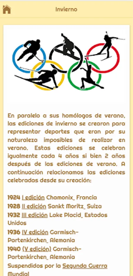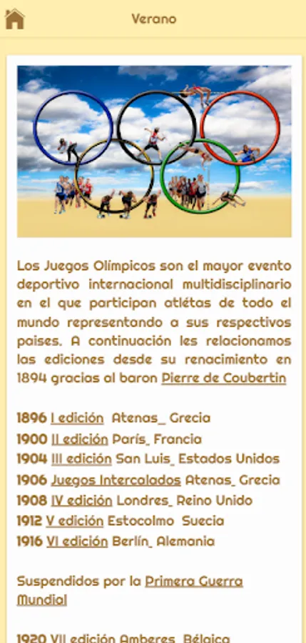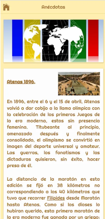 Our Olympic History and Anecdotes app traces the history of the Olympic movement from its origins in 776 BC. (the competitions that were played, the great athletes of antiquity and the importance of the Olympic Games in the society of the time) to the present day, listing the different editions of the Olympic Games that have been played since its restoration in 1894 thanks to the Baron de Coubertin.
