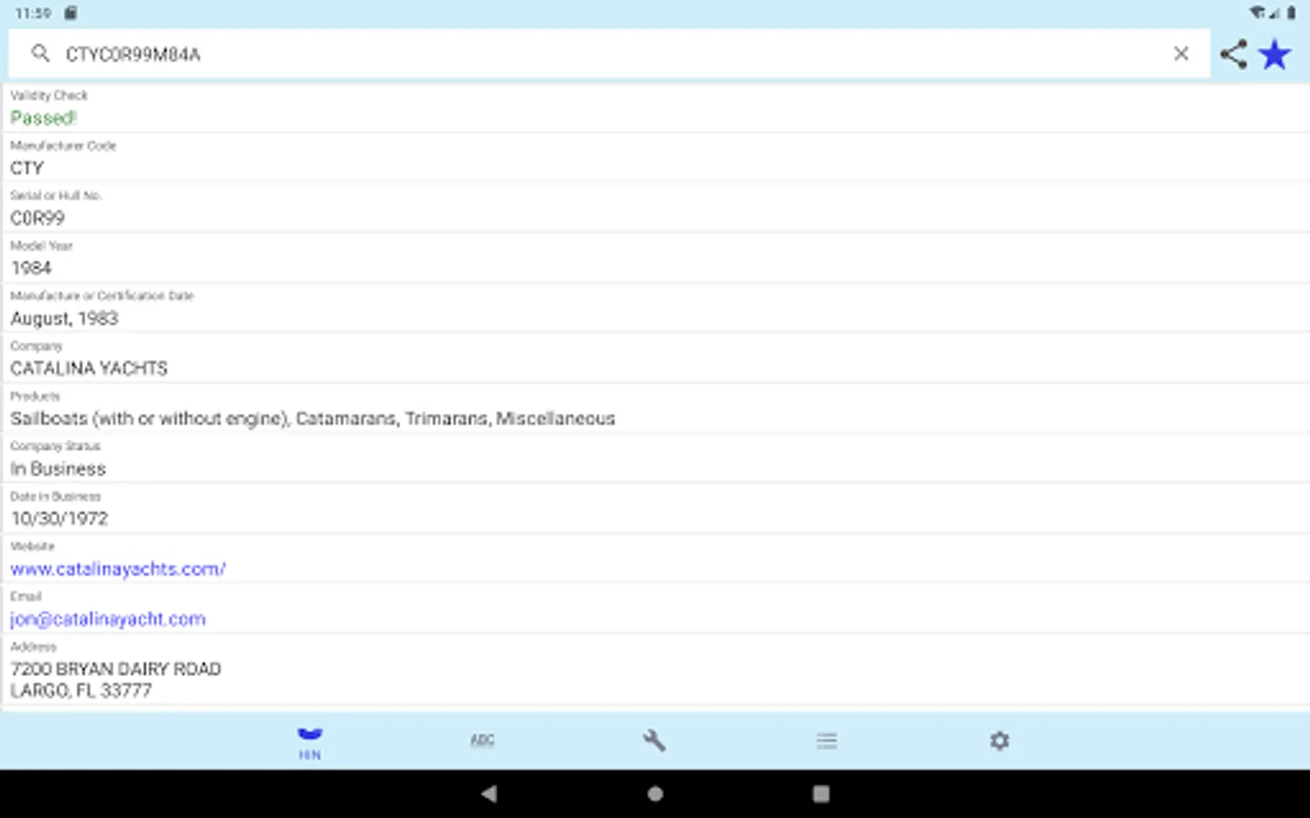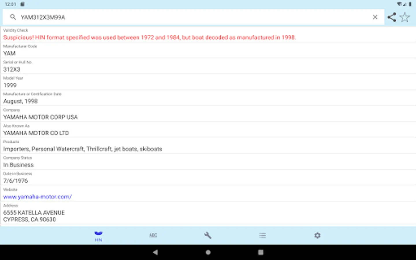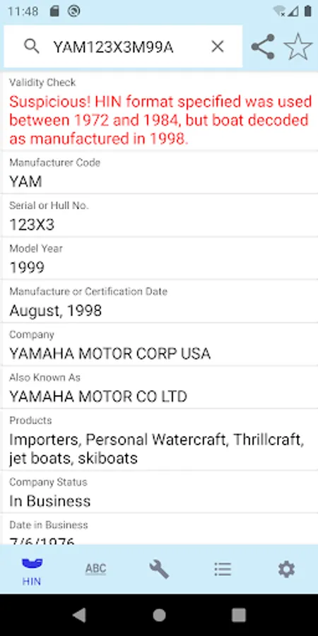 This app only decodes HINs for boats which were built or imported legally in the USA since November, 1972. Some older (1970s) boat manufacturers "in business" dates may be incorrect. The USCG records are sometimes inaccurate.