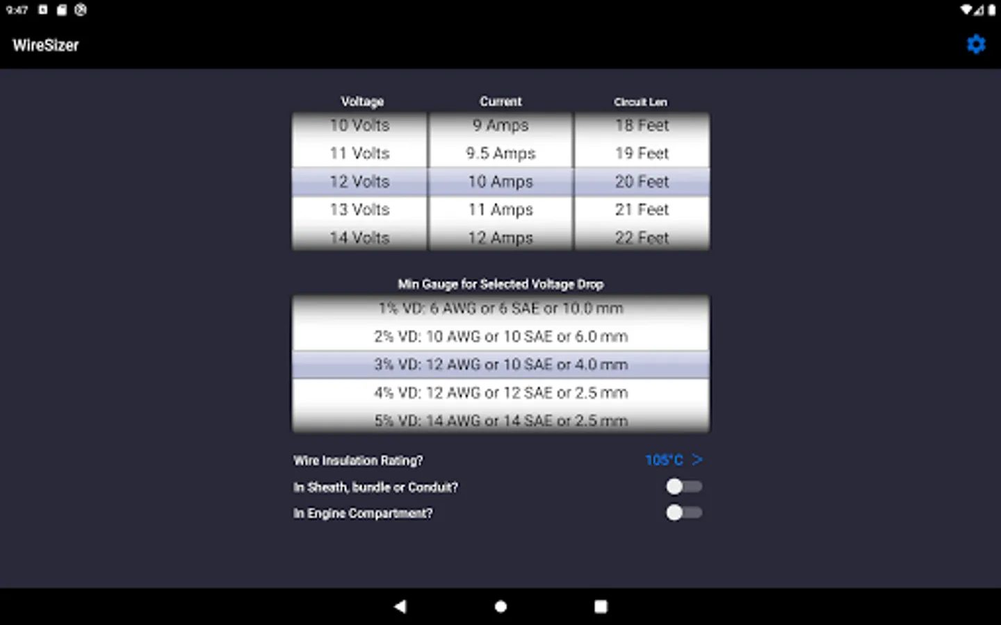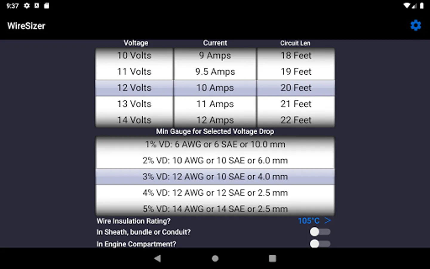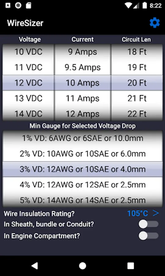 To find your proper wire, simply select your DC voltage, your current, and the length of your circuit with simple flicks of your finger. No keyboard input needed! WireSizer will automatically calculate the minimum wire size for different percentages of voltage drop under normal or "engine compartment" operating conditions using copper wire. Wire gauge recommendations include commonly available sizes in AWG, SAE and ISO/Metric.