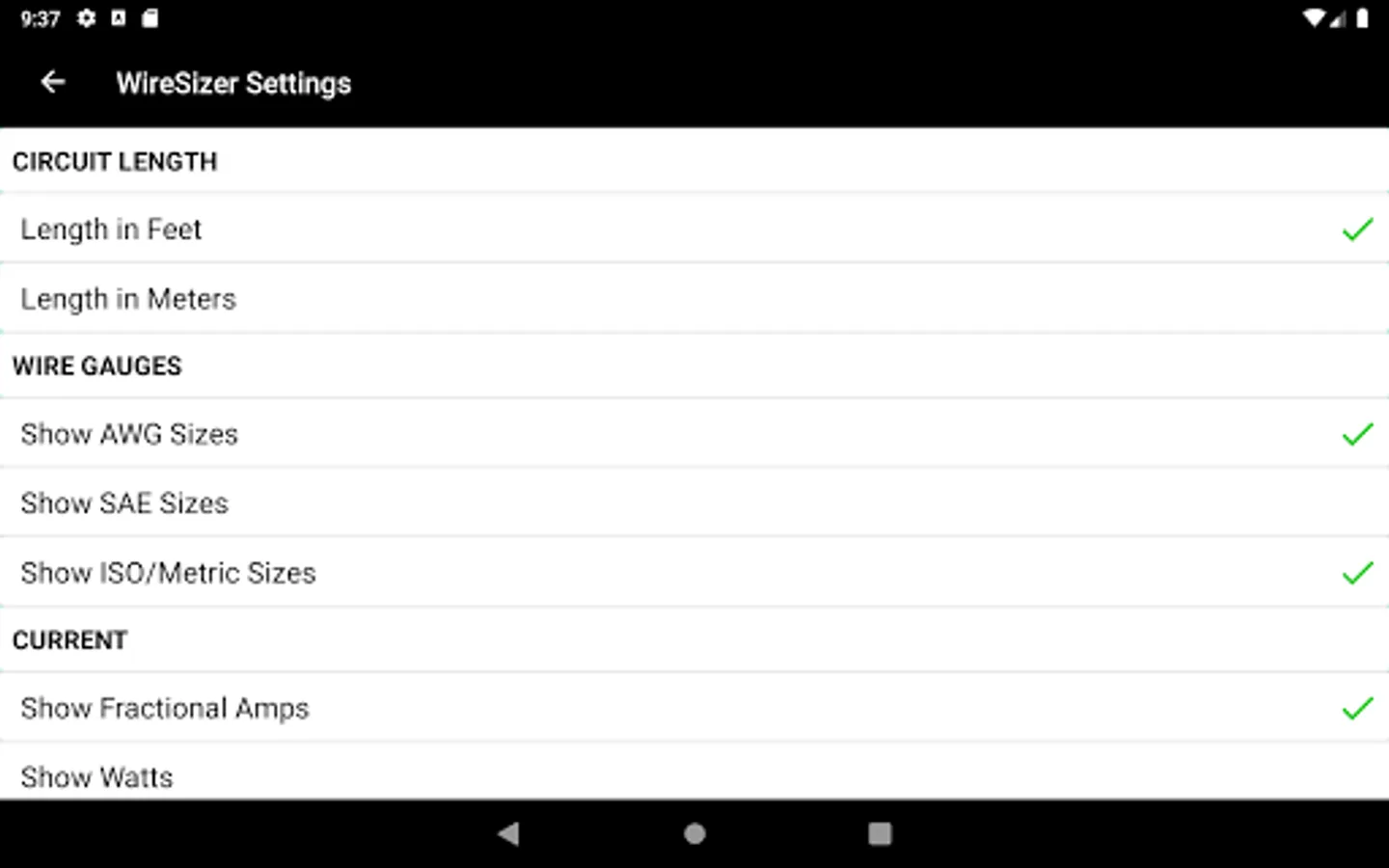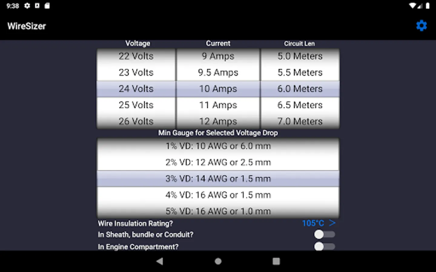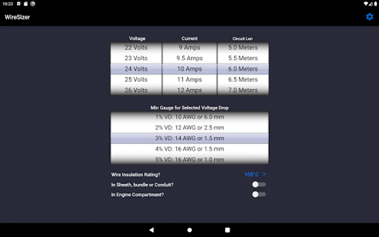 To find your proper wire, simply select your DC voltage, your current, and the length of your circuit with simple flicks of your finger. No keyboard input needed! WireSizer will automatically calculate the minimum wire size for different percentages of voltage drop under normal or "engine compartment" operating conditions using copper wire. Wire gauge recommendations include commonly available sizes in AWG, SAE and ISO/Metric.