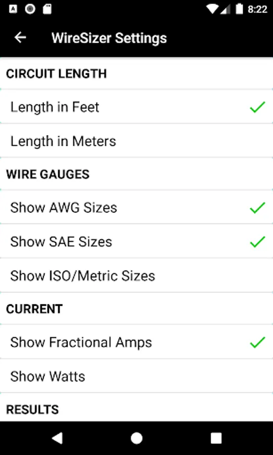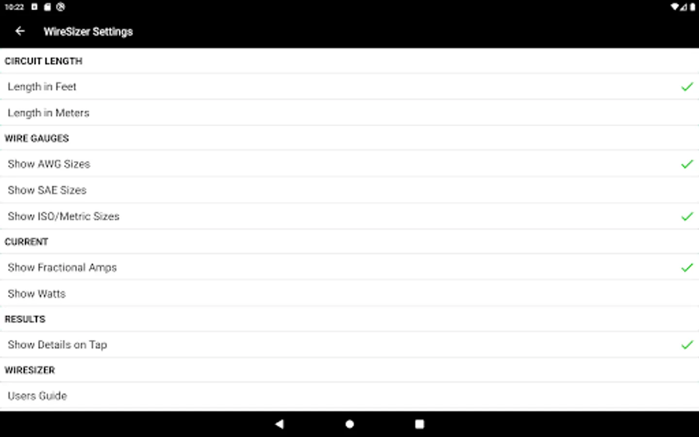 WireSizer allows you to select voltages up to 60 VDC, current up to 500 amps, and total circuit length in feet or meters up to 600 feet (or 200 meters).