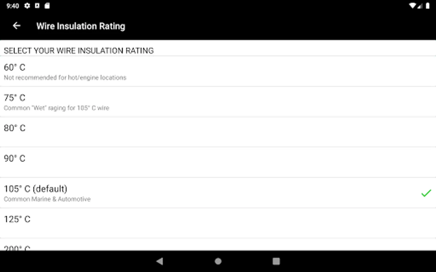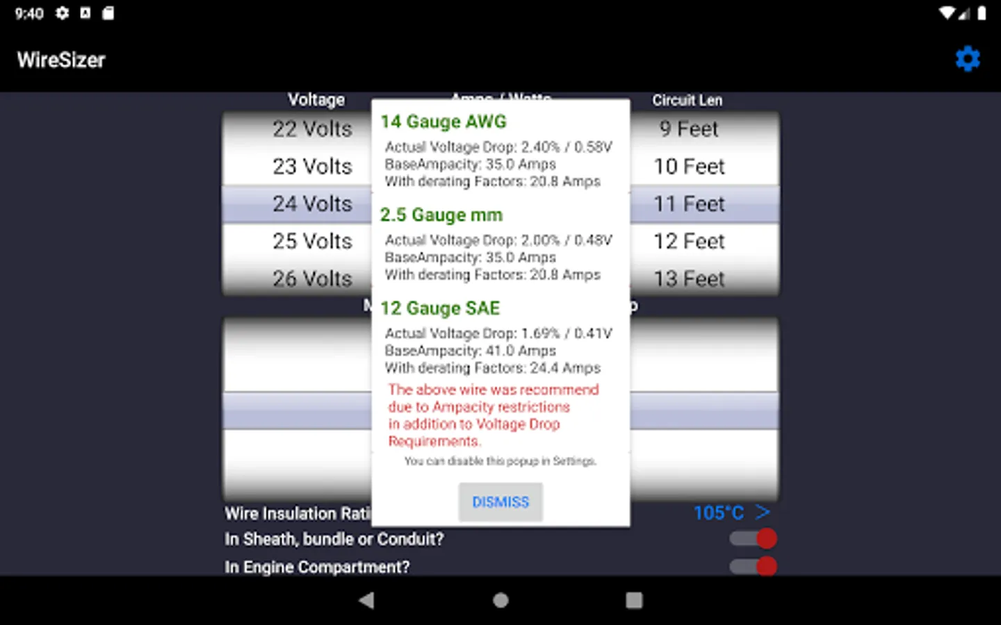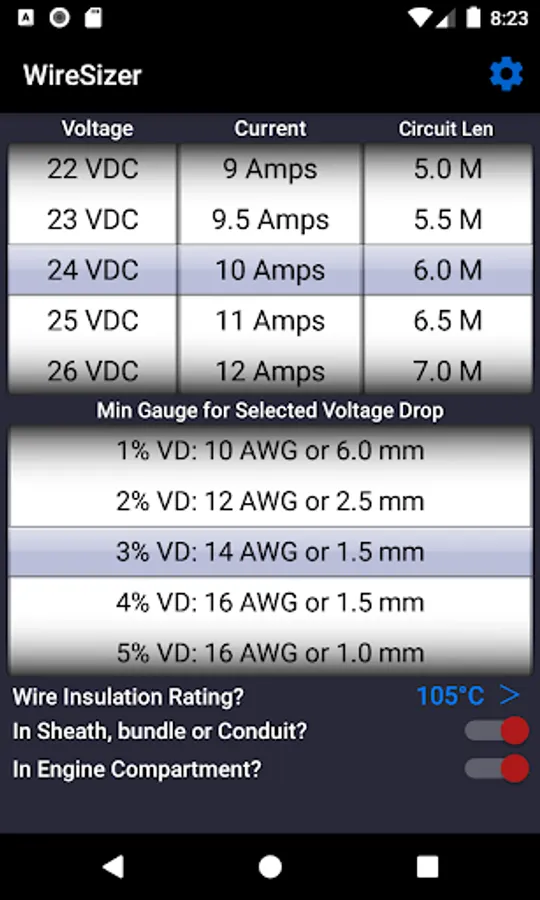 WireSizer will also let you select whether the wire is going to run through an engine compartment or a similarly "hot" environment, is sheathed, bundled, or in conduit, and select the wires insulation rating (60C, 75C, 80C, 90C, 105C, 125C, 200C) to fine tune your results.