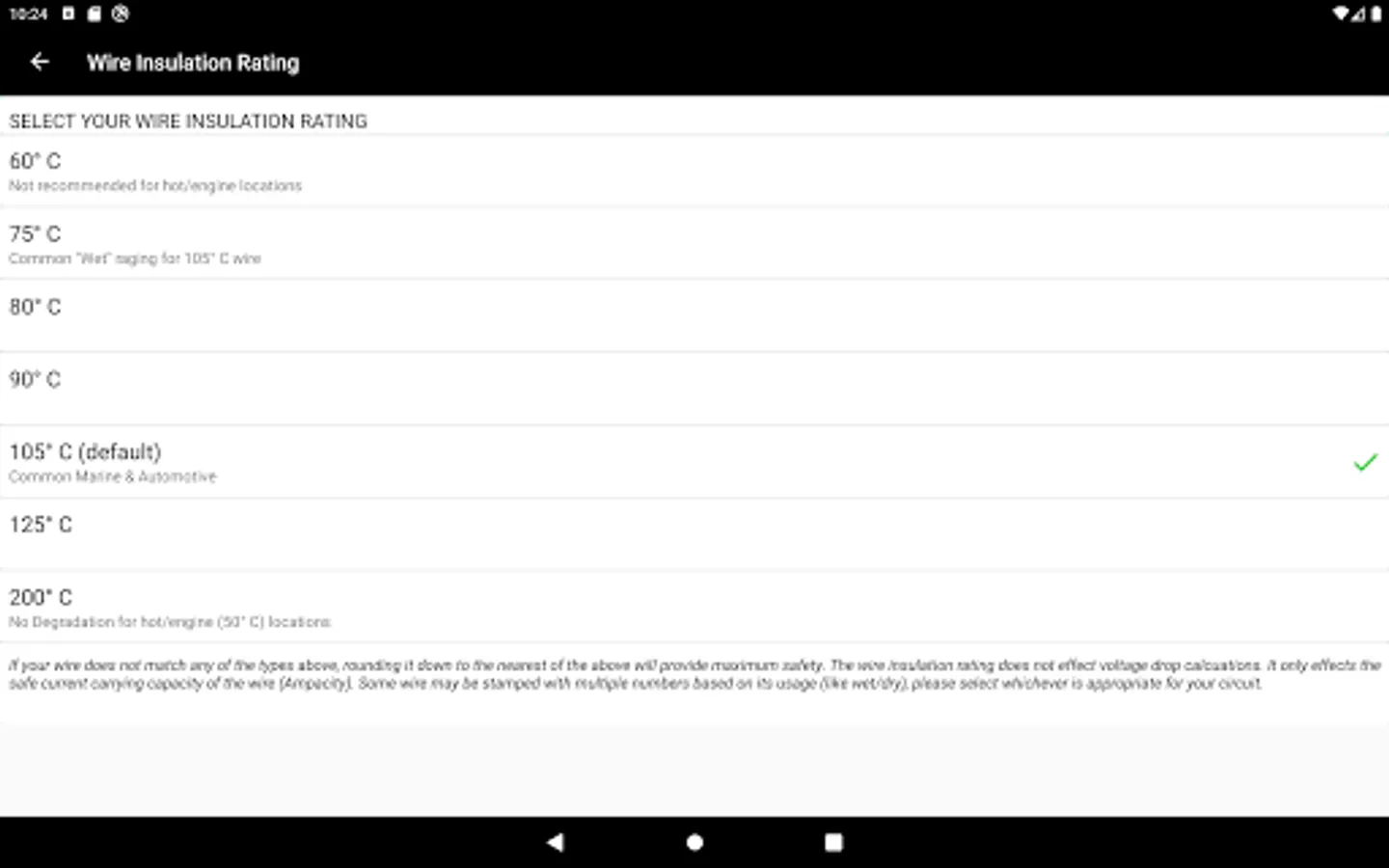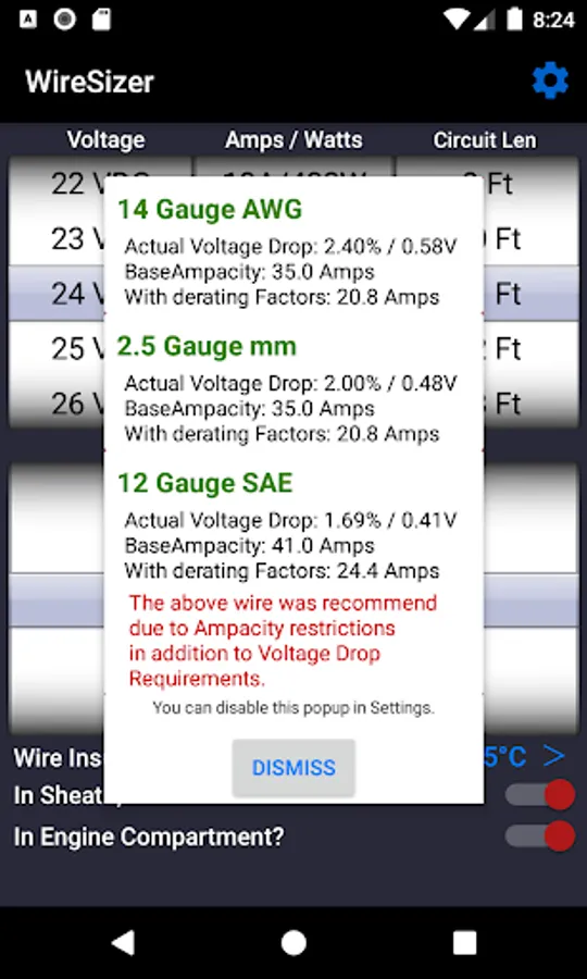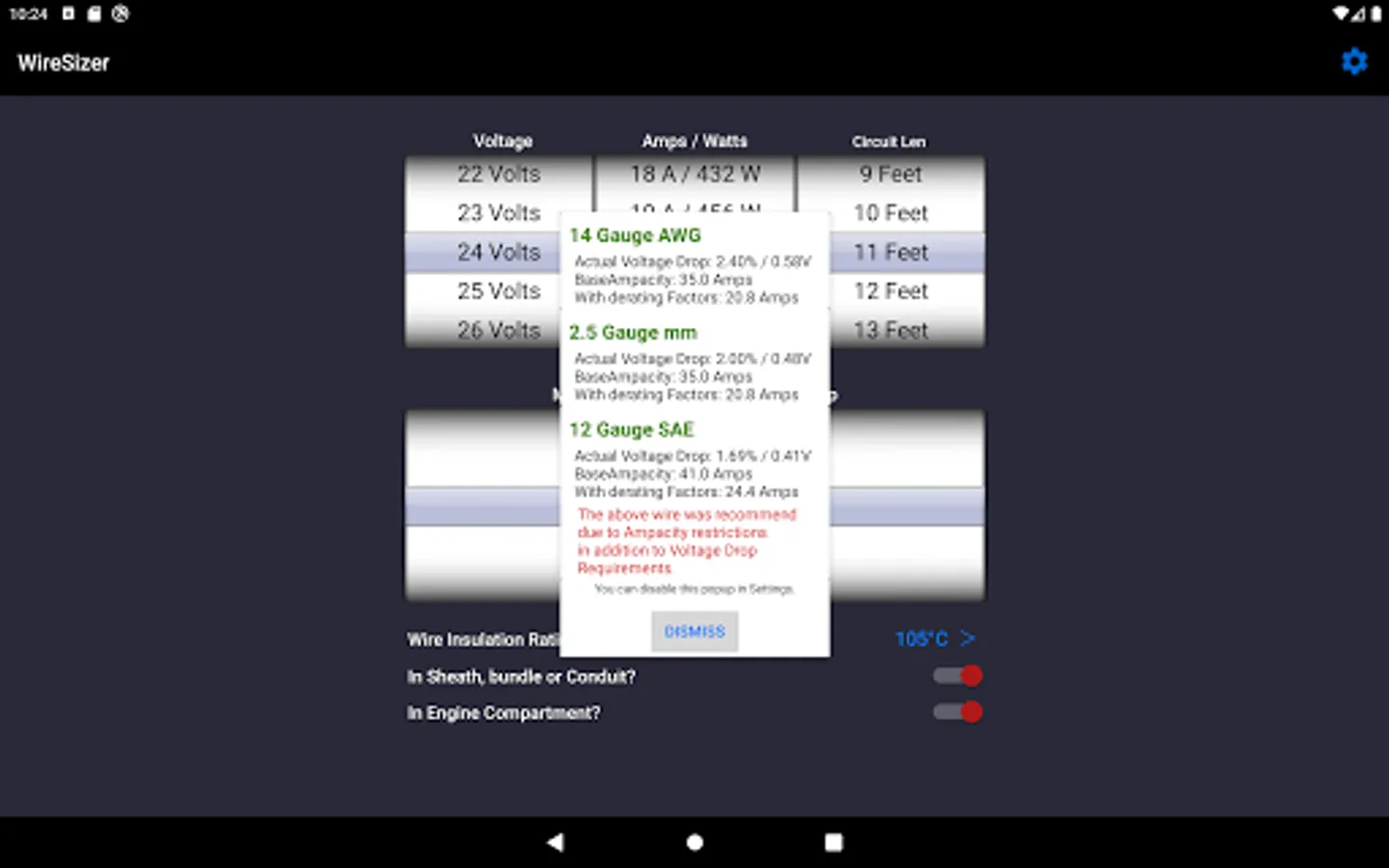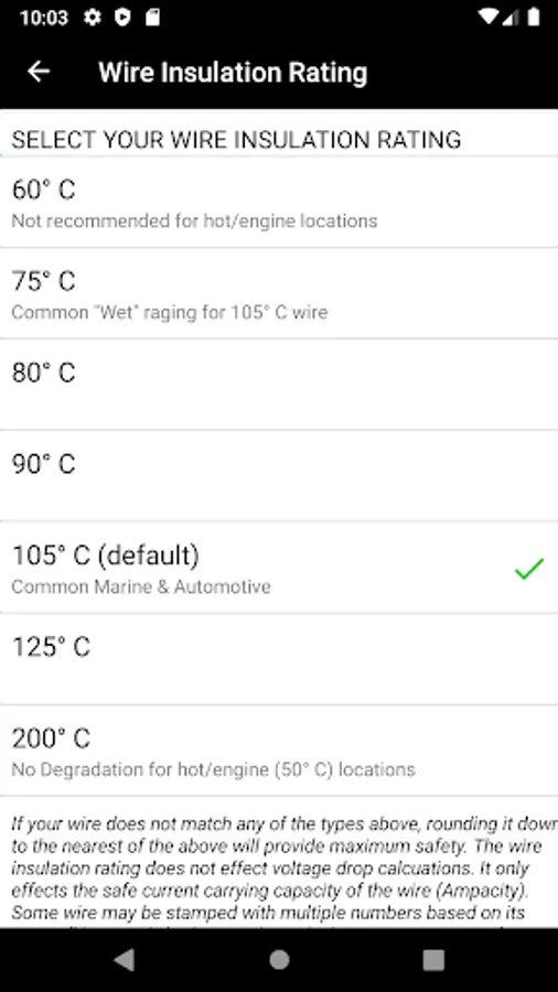 WireSizer will also let you select whether the wire is going to run through an engine compartment or a similarly "hot" environment, is sheathed, bundled, or in conduit, and select the wires insulation rating (60C, 75C, 80C, 90C, 105C, 125C, 200C) to fine tune your results.