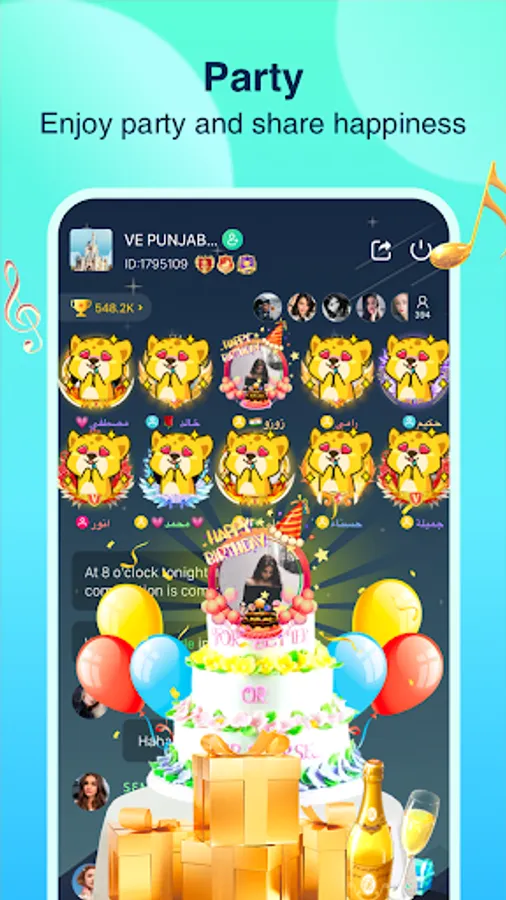 Here we have various online parties, rooms of topics in birthday party, wedding party, war drum game and so on.