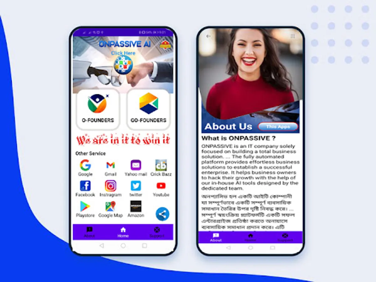 Onpassive Support apps an Explore full web browser with just like Google browser.This is an AI Technology Company that forms completely independent SaaS items utilizing the most recent AI programming advancements for our worldwide client base. AI organization gets an upper hand, development, and new points of view to business and innovation challenges. We are here to speed up advancement and change organizations from methodology to planning, execution, and the executives.