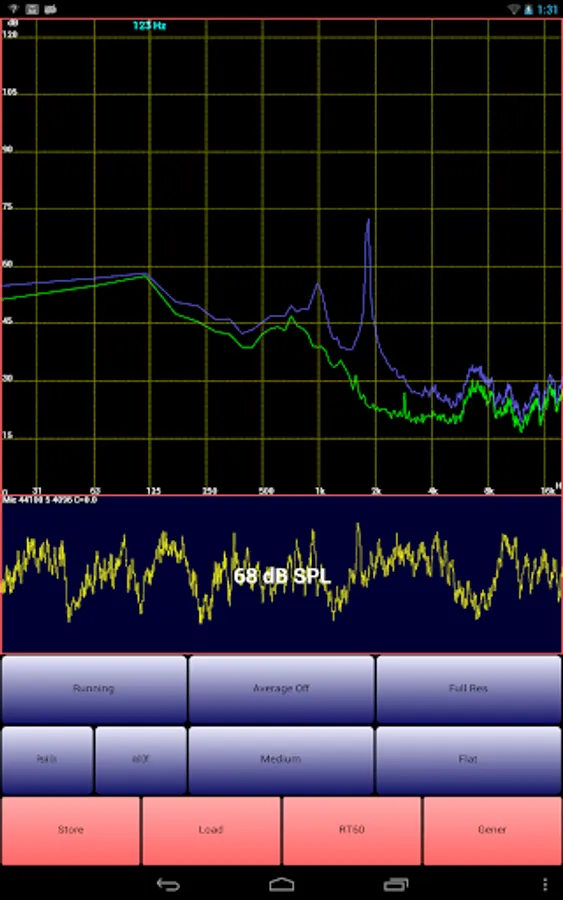 AudioTool FFTs sets of microphone samples. Aliasing reduced by Hann windowing. SPL calculated in realtime. Spectra may be saved, then loaded and displayed with the live spectrum. The "Store" button stores the current live spectrum - "Load" shows a list of stored spectra to select.