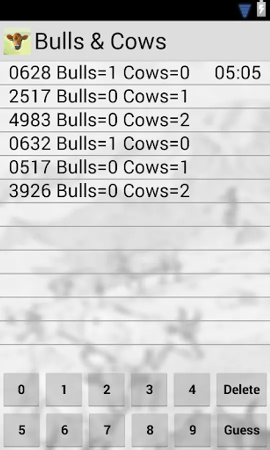 Bulls and Cows Game is also known as MasterMind. The program generates a four digit number, all four digits are different. Any number can be guessed in 7 tries or less. To the right column displays total number of digits you guessed right - "Cow", "Bulls" shows how many of those that exists were placed at the right place .