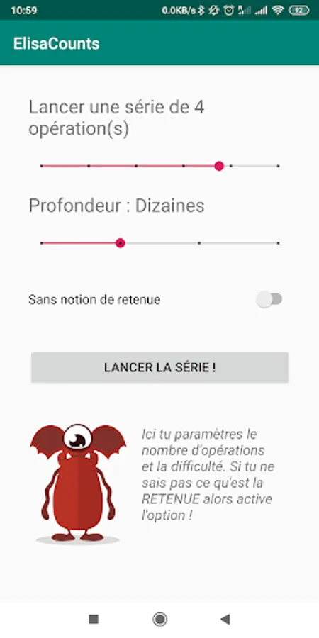 For additions and subtractions, it is possible to set the size of the numbers in the series: from unity to thousands, with or without restraint depending on the level of learning.