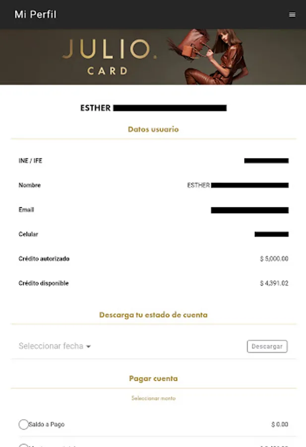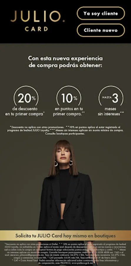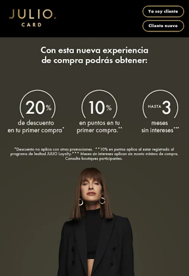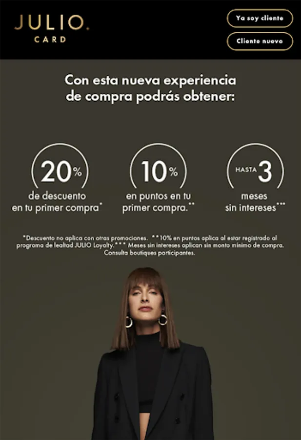 JULIO is inspired by independent, determined and successful women, with our commitment to offer a shopping experience to our customers, we created JULIO CARD, it is a program that consists of offering direct credit from JULIO so that our customers make purchases exclusively in our boutiques.