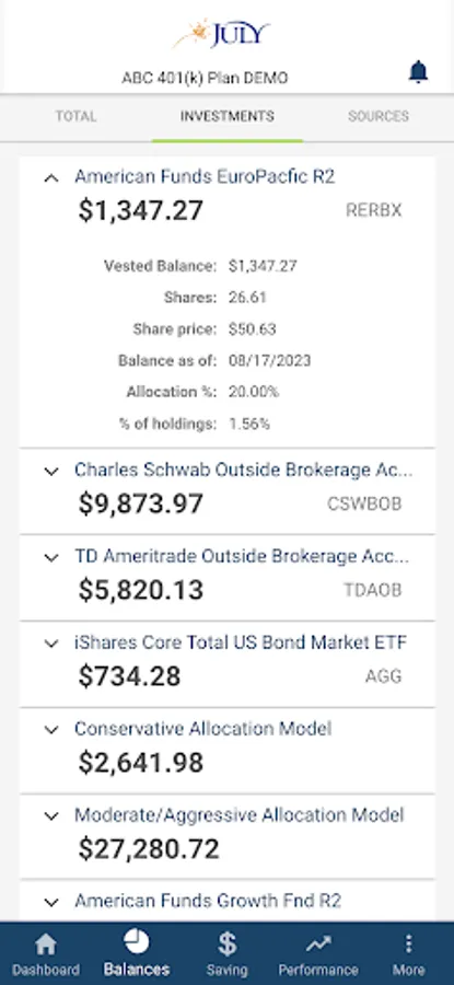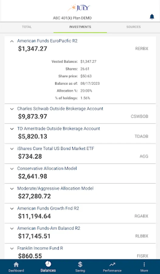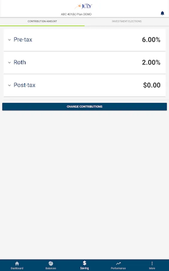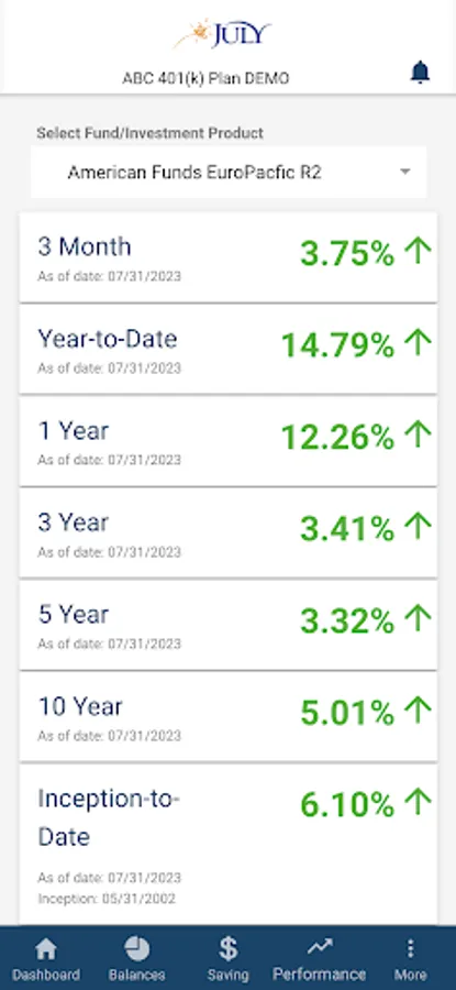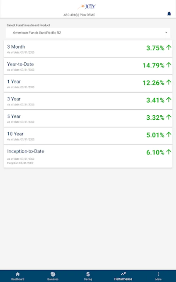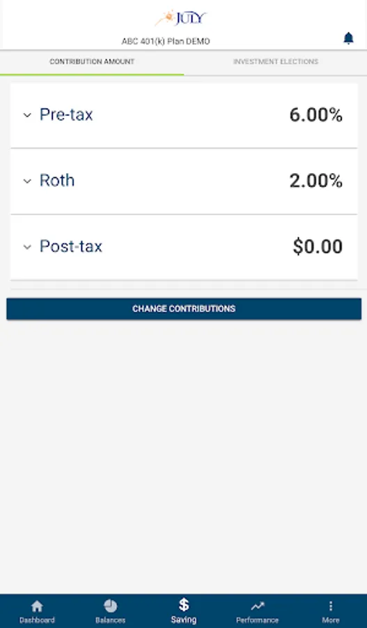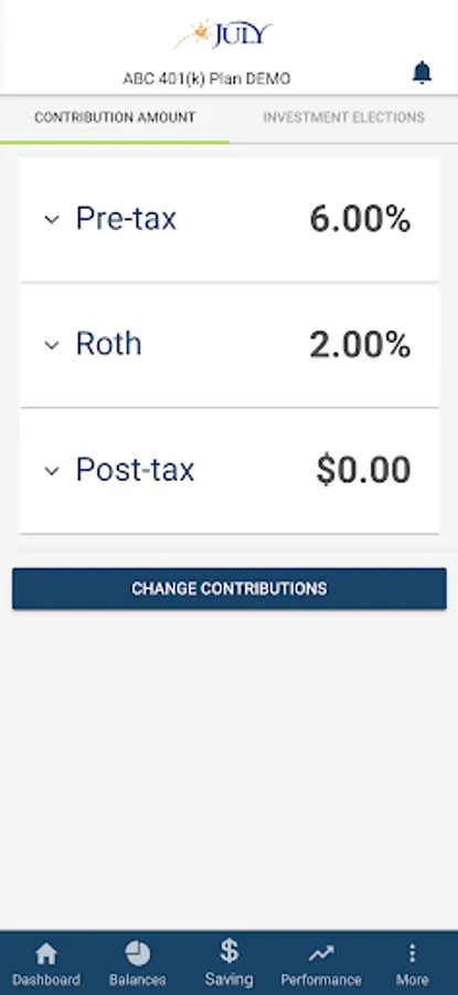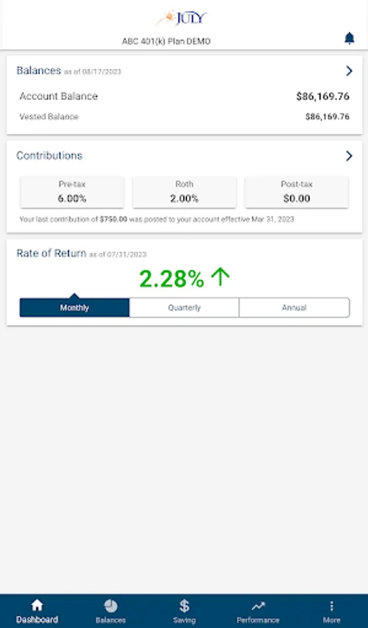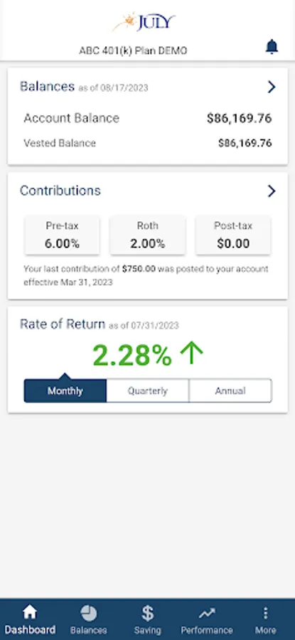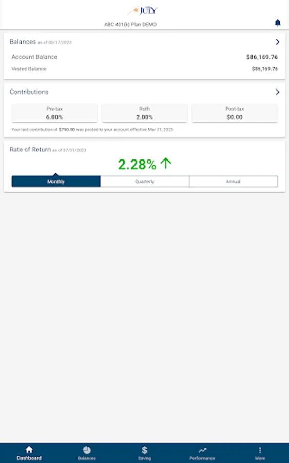 The JULY Retirement app provides you with on-demand access from your mobile device to your retirement account with JULY. With this app, you can view your account balance, review fund performance, view/update your contribution rate, and modify your account password.