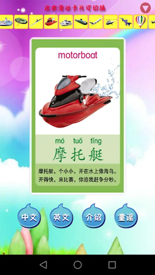 "Kids learn vehicles" is an interactive app designed for children aged 2-6 to help babies learn common transport vehicles,Chinese and English earlier. The use of real children's voice through the interesting explanation of the cards and the recitation of nursery rhymes can attract baby's attention and stimulate their interest in learning.