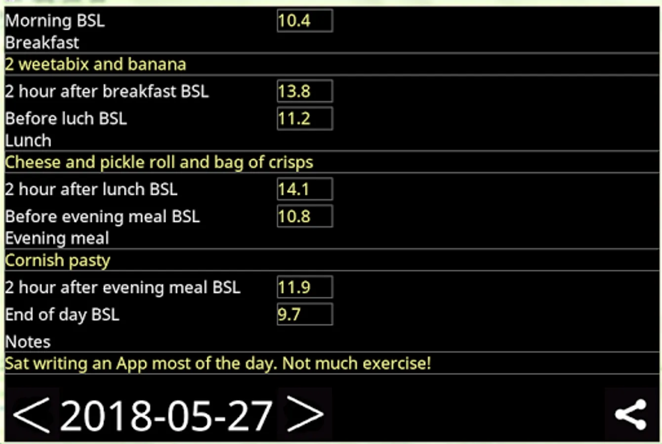 Enter what you eat and your blood sugar levels throughout the day. Compare daily figures and email them to yourself for analysis with a spreadsheet.