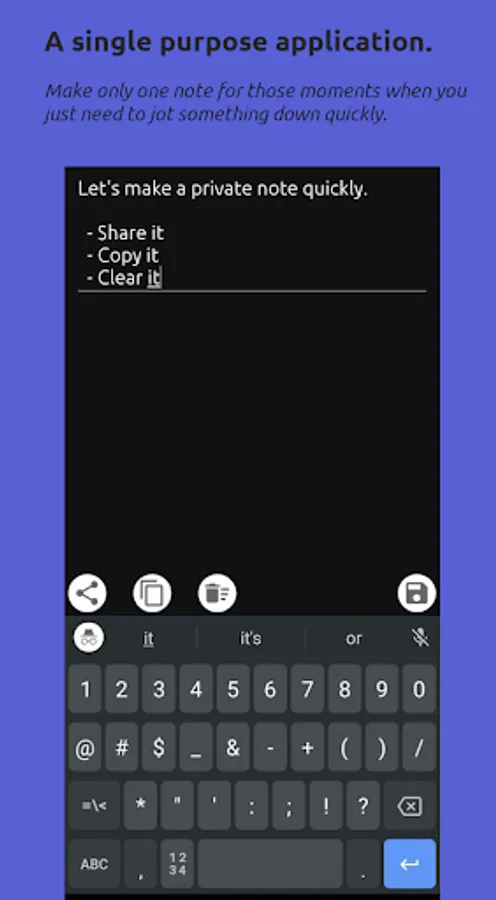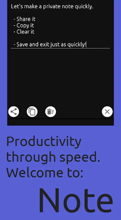 Have you ever wanted to jot down a note quickly without all the button clicks and sophistication normally attached to note-taking applications? Note is a single purpose platform. It is meant to give you quick access to an area where you can type, paste, or modify existing textual material. This allows you to quickly and conveniently save it for later or deal with an immediate need that requires collation of text from a multitude of sources. Its even good for taking down simple things like a name, a phone number, an email, or a website while you are still on the phone with someone and don't have a pen and paper right next to you. Imagine feeling more productive because technology empowers you instead of making you feel discombobulated. That's the power of Note.