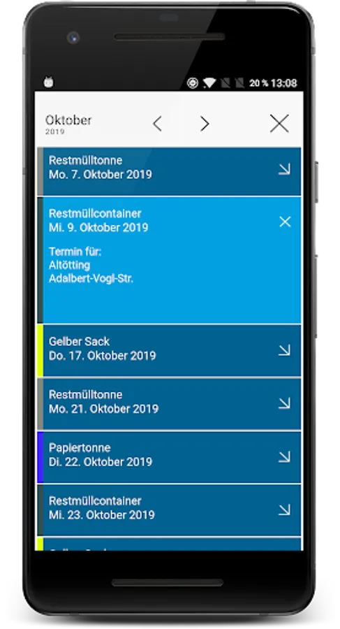 The menu item »Appointments« displays the check list for the current month. It can be scrolled monthly back and forth. Pick-up dates from the past are displayed in gray.