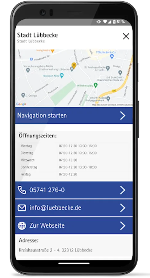 So everyone is in the right place at the right time. The locations are marked with pins on an overview map. With a hint on the pin, the detailed information about the location is displayed. When opening hours are defined, the color marker of the pin indicates the availability of the location: The user can start navigation to the location.