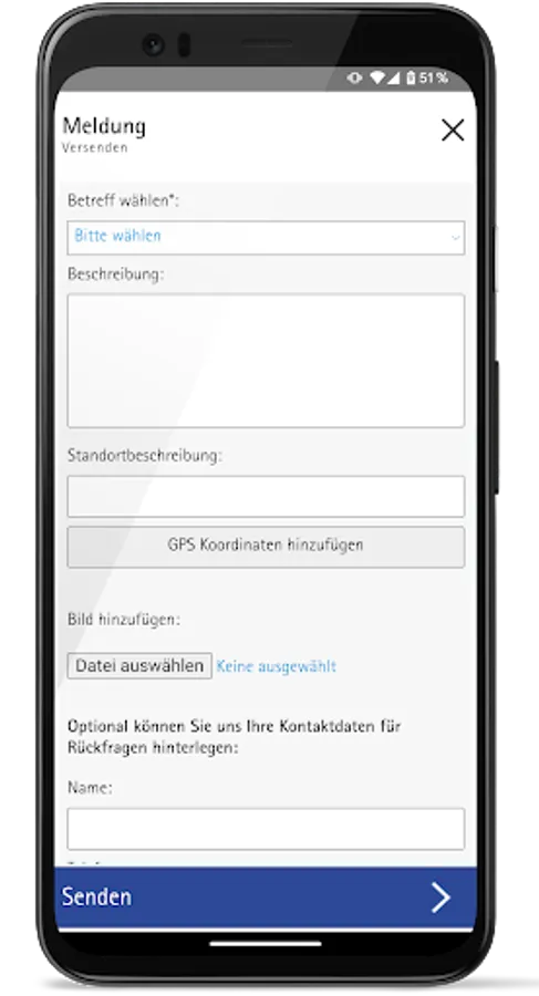 With text, image and GPS data attached, a message can be sent to the administration. For GPS data transmission, the location on the map is marked with a crosshair.