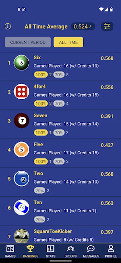 TRACKS players’ 70s and 100s. Games above 70% accuracy plus perfect games.