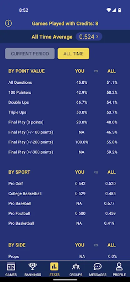 STATISTICS. Buy and use credits for games to be included in your historical game play statistics to gain insight into how well you take sides by sport, the type of question, and spot.