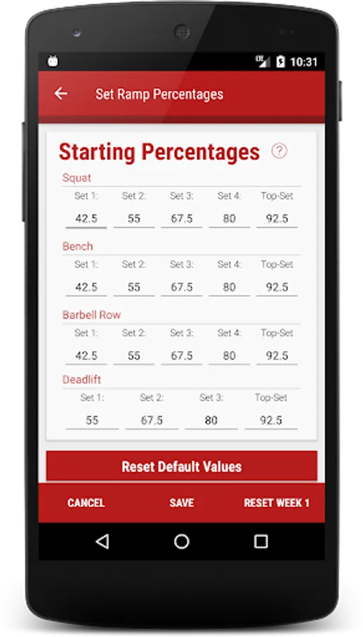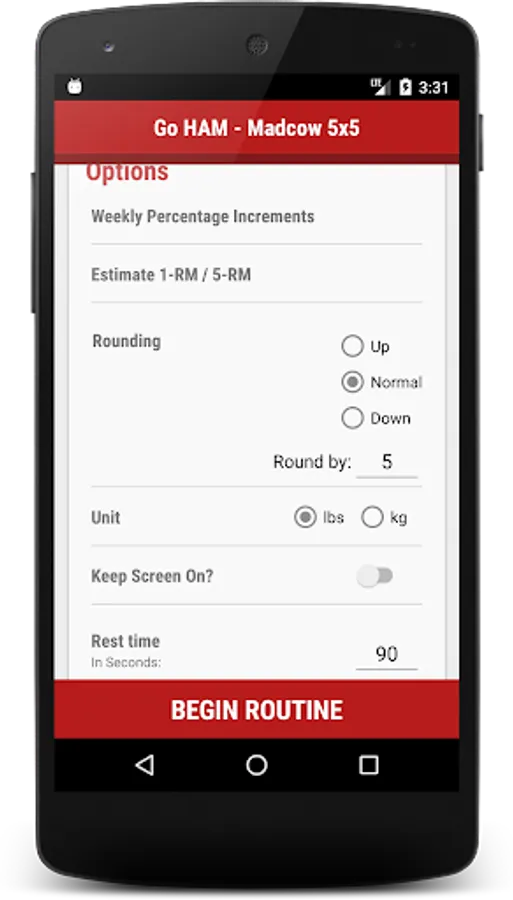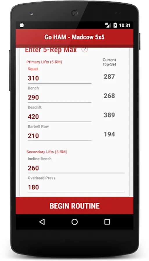 With the Go HAM Madcow 5x5 app, you can customize your powerlifting workout and calculate your numbers based on your 5-RM lifts. Simply enter your 5-RM's into the app and you're good to go.