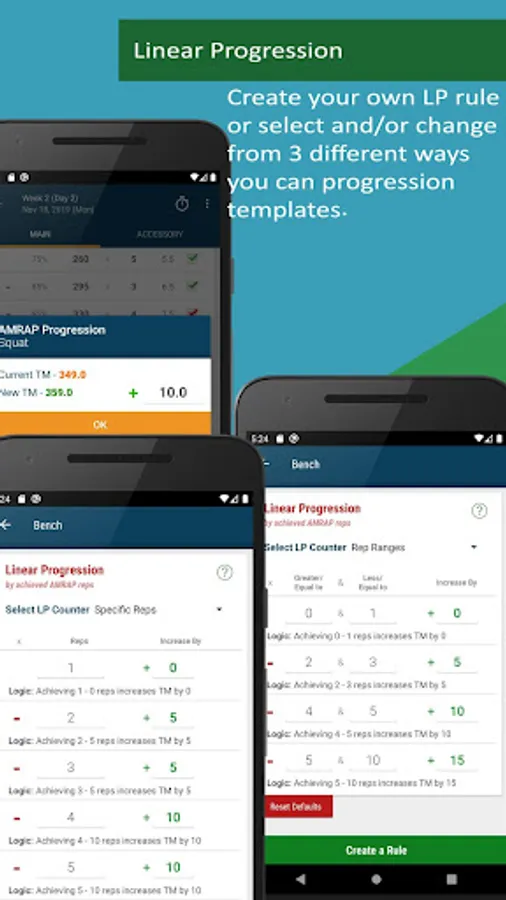 💪 Linear Progression. Create your own way of progression or choose from 2 templates. Either a range of reps or specific reps. OR create your own rule.