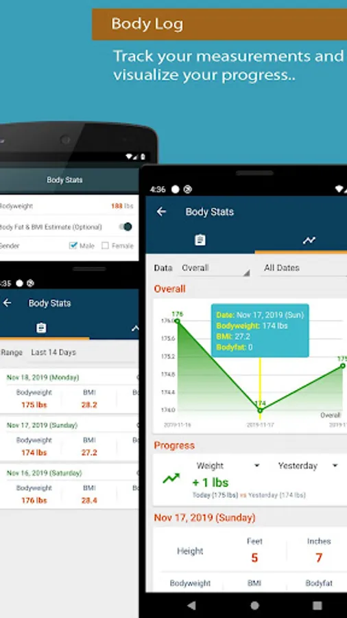 💪 Body Log. Log your weight and body measurements each day and calculate estimated BMI and body fat that can be viewed historically and by charts.