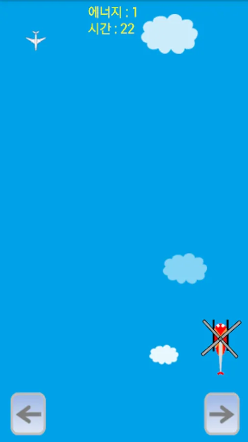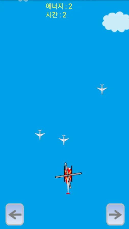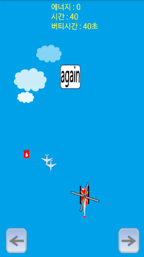 The protagonist is a helicopter with a rotating propeller, and you can control the helicopter with the arrow keys on the bottom right and left. At the top of the screen, an airplane flies. If an airplane and a helicopter collide, one of the three lives is reduced. If all three lives are exhausted, the game ends and the time is recorded. If it collides with the red energy (red fuel tank) flying from the top, 1 life is added, and if it collides with the gold energy (gold fuel tank), 3 lives are added. Energy comes down every certain time. Survive as long as possible without colliding with the plane and challenge the best record!
