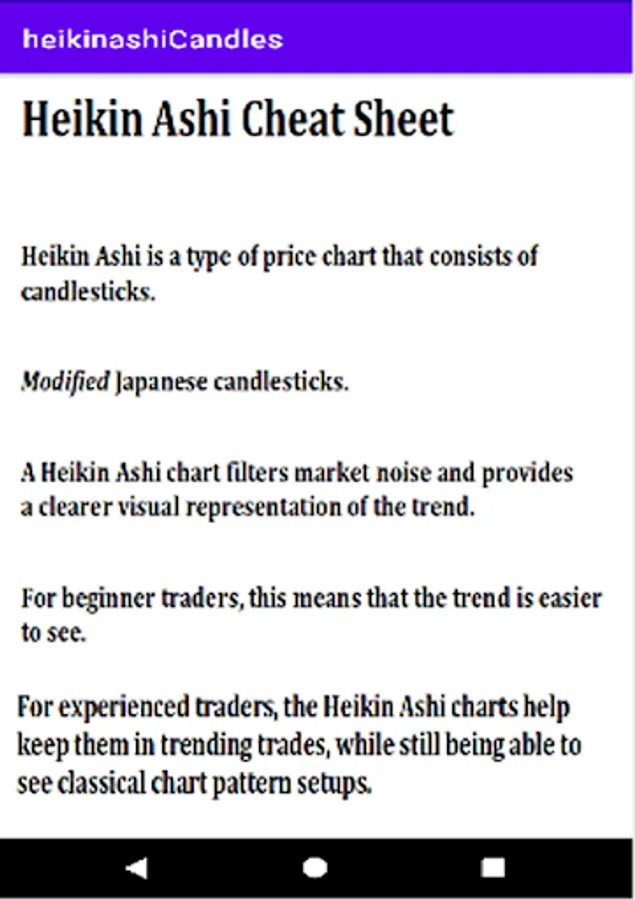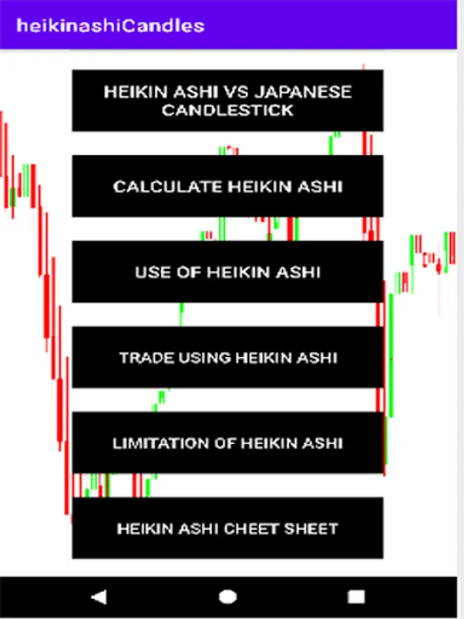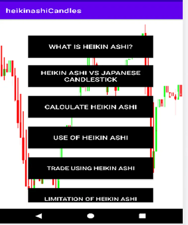 Heikin ashi trading is part of Technical analysis of forex trading and Stock trading heikin ashi is kind of candlestick and it has own pattern to trade mostly Traders don't know about how to trade it. We try to Explain how to trade it perfectly but maybe some Traders not pick some points this app will help you to identitfy all the aspect of Heikin Ashi Trading Candles. This is Japanese technique to trade different types of markets to make handsome profit from it.