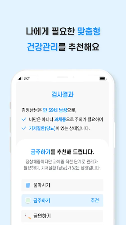 We recommend customized health care through a simple survey! Don't skip it, you can get a more accurate report by completing the survey :)