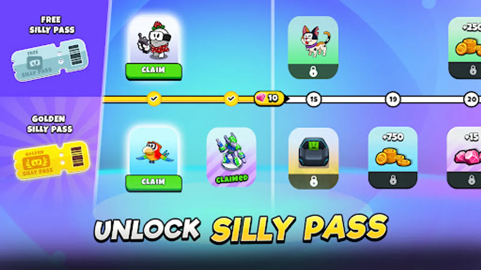 Equip the Golden Silly Pass & complete fun missions to win legendary pets, epic lobby items, 2x coins and 2x gems. Complete stage missions to level up and unlock exclusive character skins.