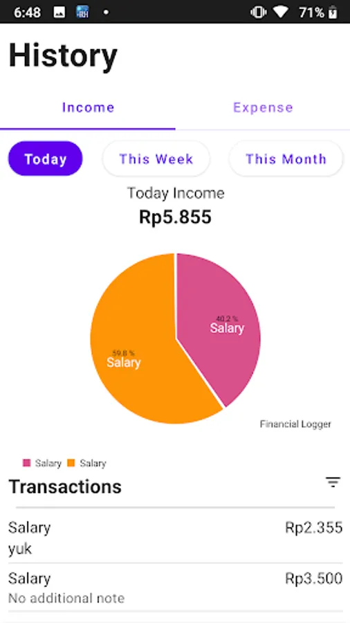 Financial Logger app help you to add and maintain records of any expense that happen weekly, daily or monthly, whether it is for food beauty, petrol, transportation, health, rent, self-development and list goes on. Incomes are classified by allowance, salary, profit, cash bonus etc