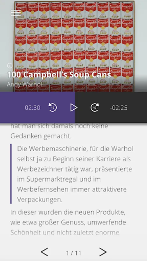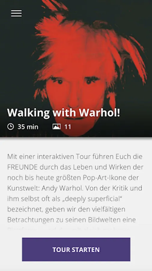 This app was designed to accompany your visit to the "Andy Warhol Now" exhibition as a short tour of the FREUNDE initiatives. It can of course also be operated on site, at home or on the go. Listen to the tour or read the text on your smartphone and discover new details through additional images.