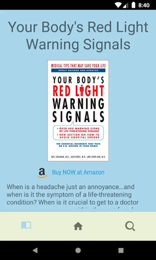 This app is based on the book Your Body's Red Light Warning Signals. It was created as a volunteer effort for school credit by students in the junior design course at Georgia Tech. The app can recognize 233 unique diagnoses with 487 different symptom paths leading to those diagnoses.