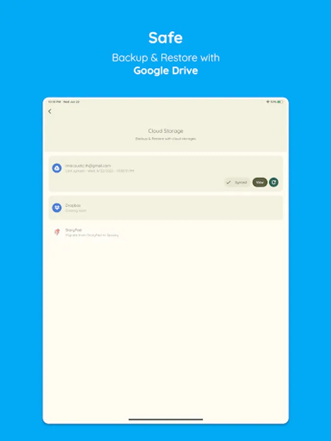 By default, your data is stored offline, but you can backup and restore your data directly to your cloud account such as Google Drive.